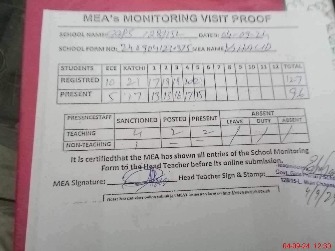 | Attendance Register | Head Teacher | MEA with School | Visit Proof |