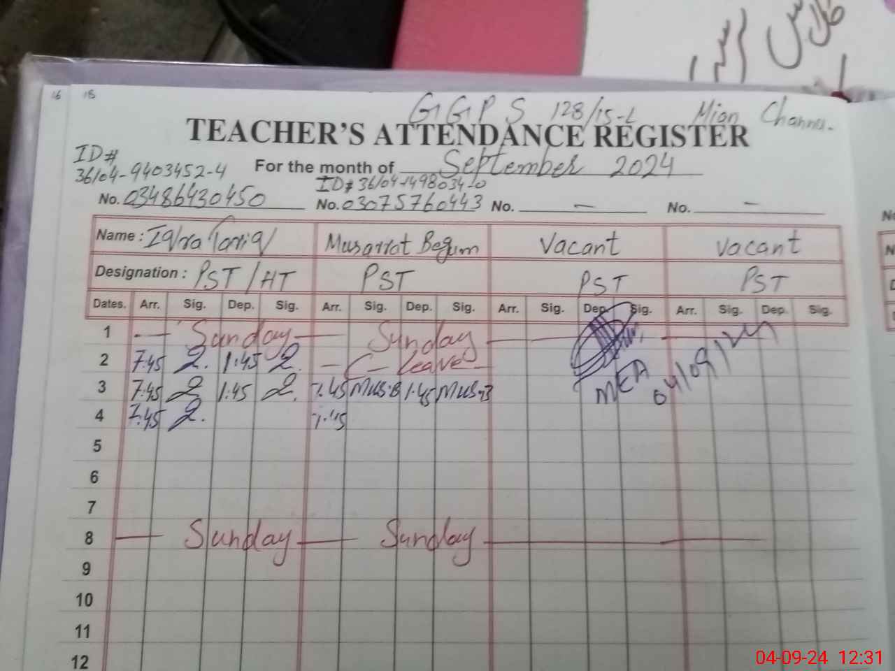 | Name: Iq**** Ta**** Designation: (School Headmaster's/Headmistress's) PST Phone/Cell Number: 03**** |