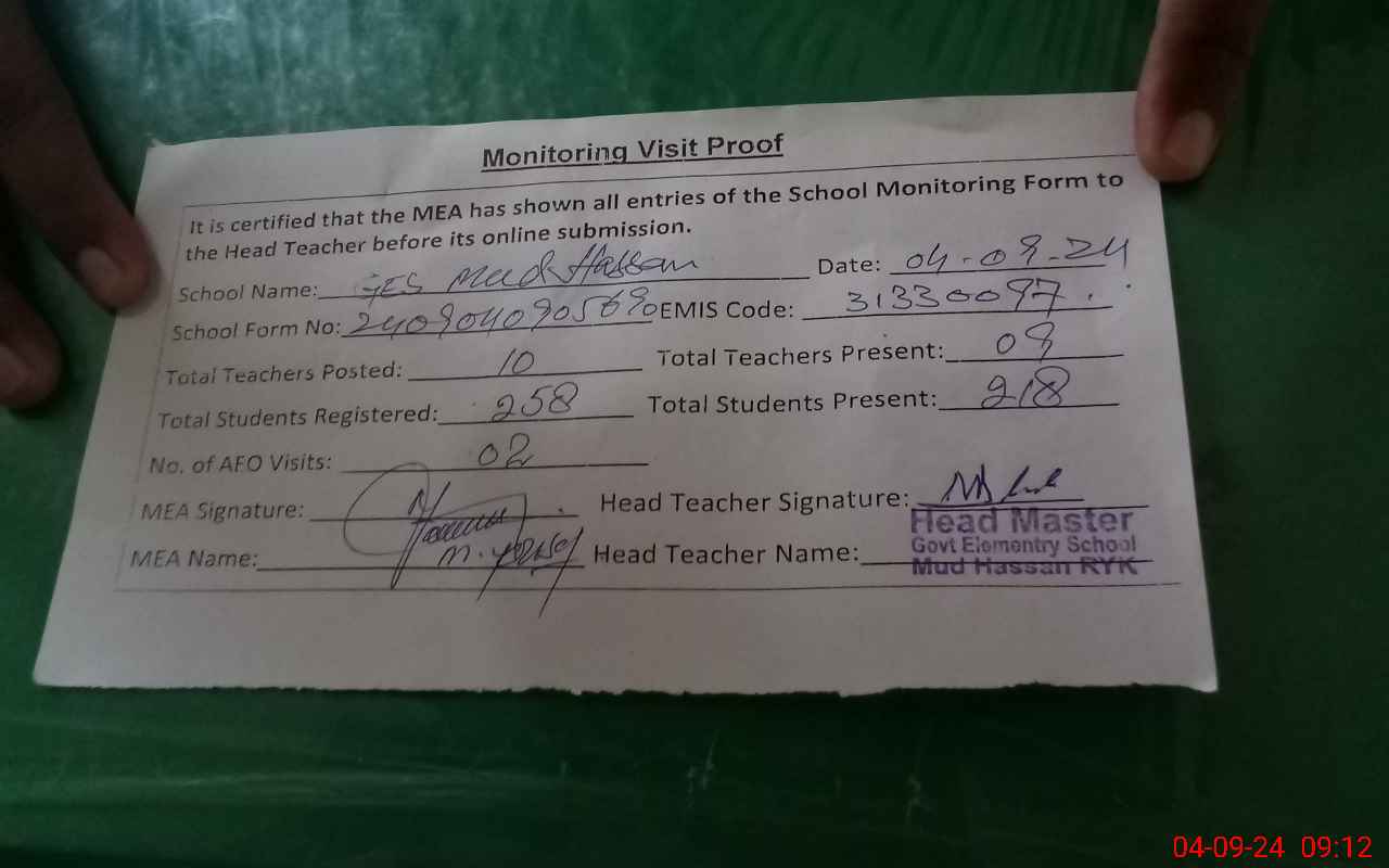 | Attendance Register | Head Teacher | MEA with School | Visit Proof |