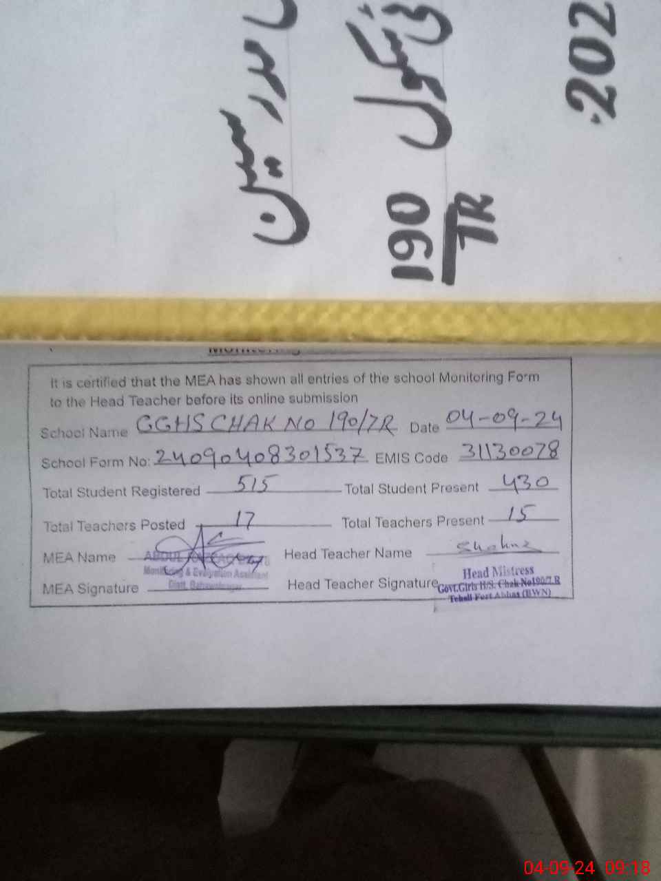 | EMIS Code: 31130078 | Name of School: GGHS CHAK NO 190/7-R | |||
