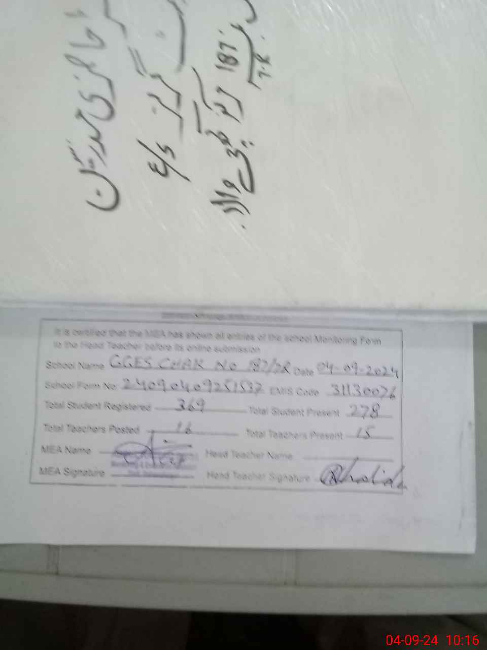 | EMIS Code: 31130076 | Name of School: GGES CHAK NO 187/7-R | |||