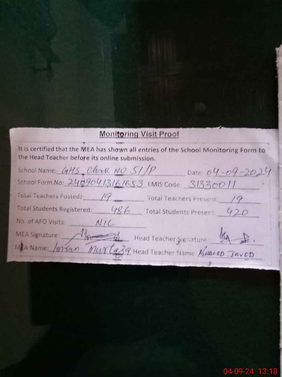 | EMIS Code: 31330011 | Name of School: GHS CHAK NO 51 P | |||