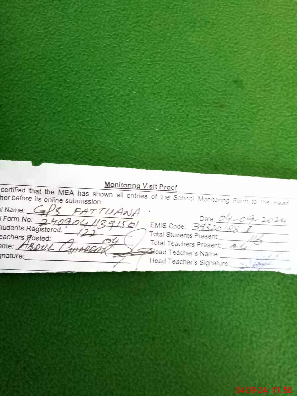 | Attendance Register | Head Teacher | MEA with School | Visit Proof |