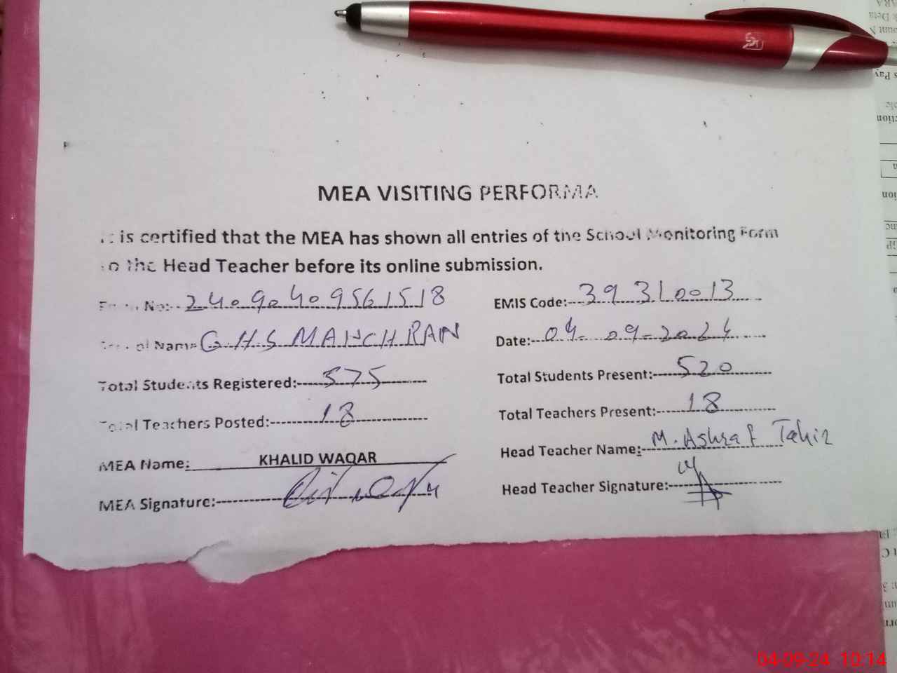 | EMIS Code: 39310013 | Name of School: GHS MANCHRIAN | |||