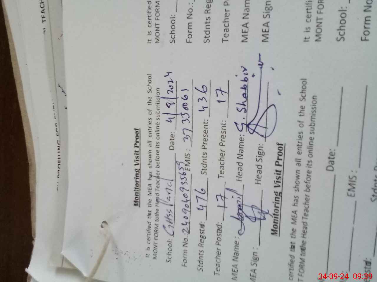 | Attendance Register | Head Teacher | MEA with School | Visit Proof |