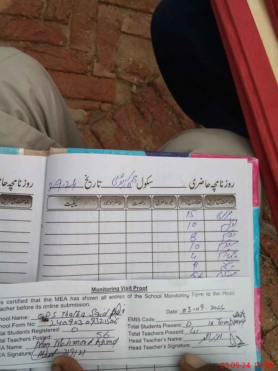 | Attendance Register | Head Teacher | MEA with School | Visit Proof |