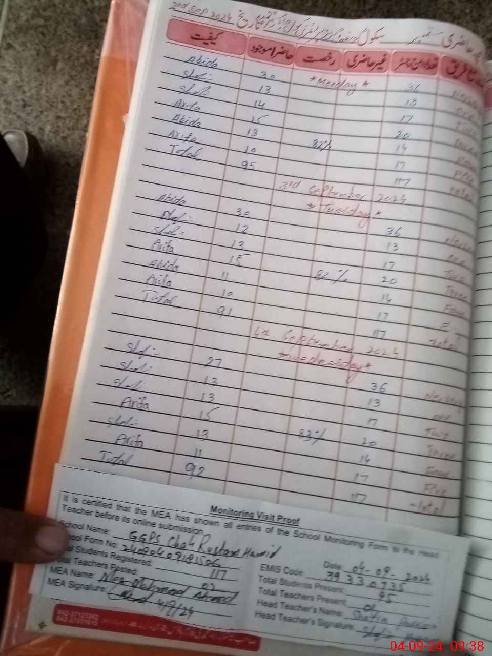 | Attendance Register | Head Teacher | MEA with School | Visit Proof |
