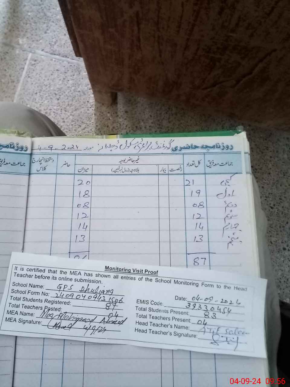 | Attendance Register | Head Teacher | MEA with School | Visit Proof |