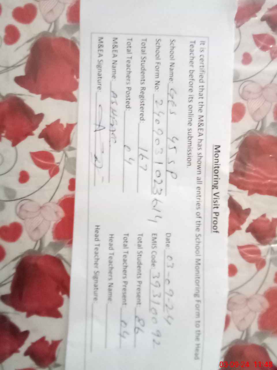 | Attendance Register | Head Teacher | MEA with School | Visit Proof |