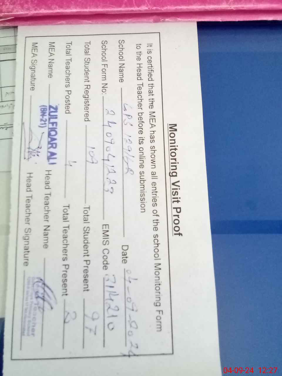 | Attendance Register | Head Teacher | MEA with School | Visit Proof |
