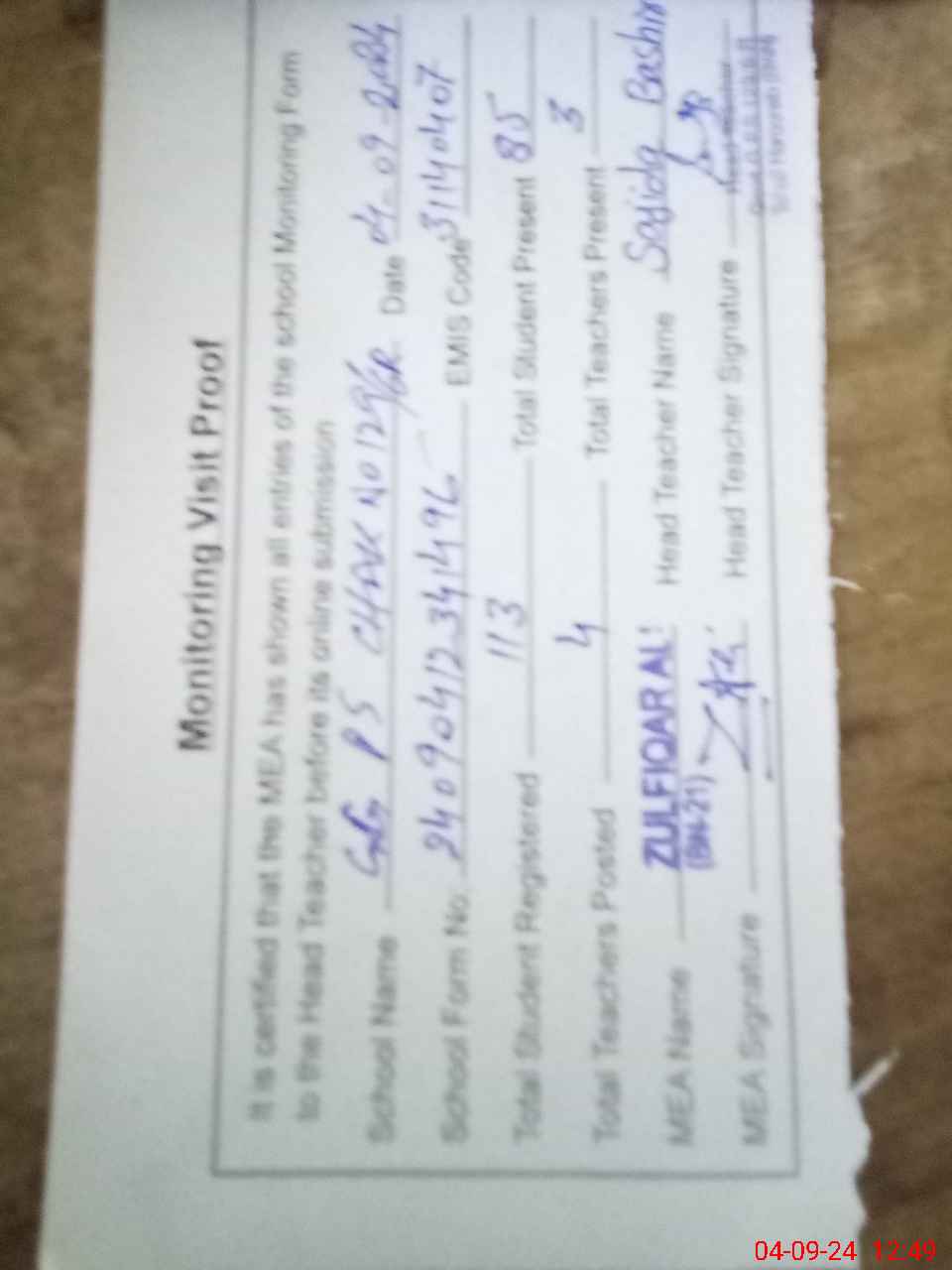 | Attendance Register | Head Teacher | MEA with School | Visit Proof |