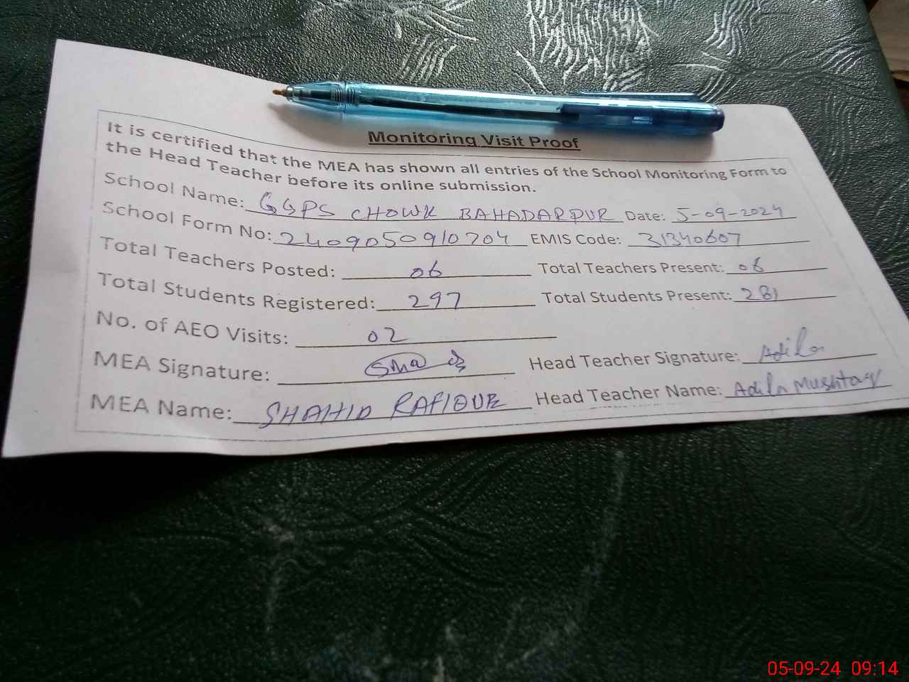 | Attendance Register | Head Teacher | MEA with School | Visit Proof |