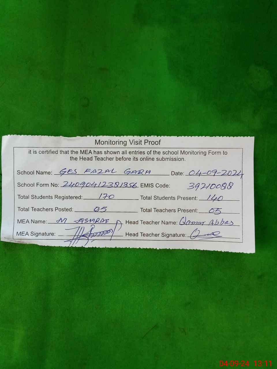 | EMIS Code: 39210088 | Name of School: GES FAZAL GARH P.O BOYLE GANJ | |||