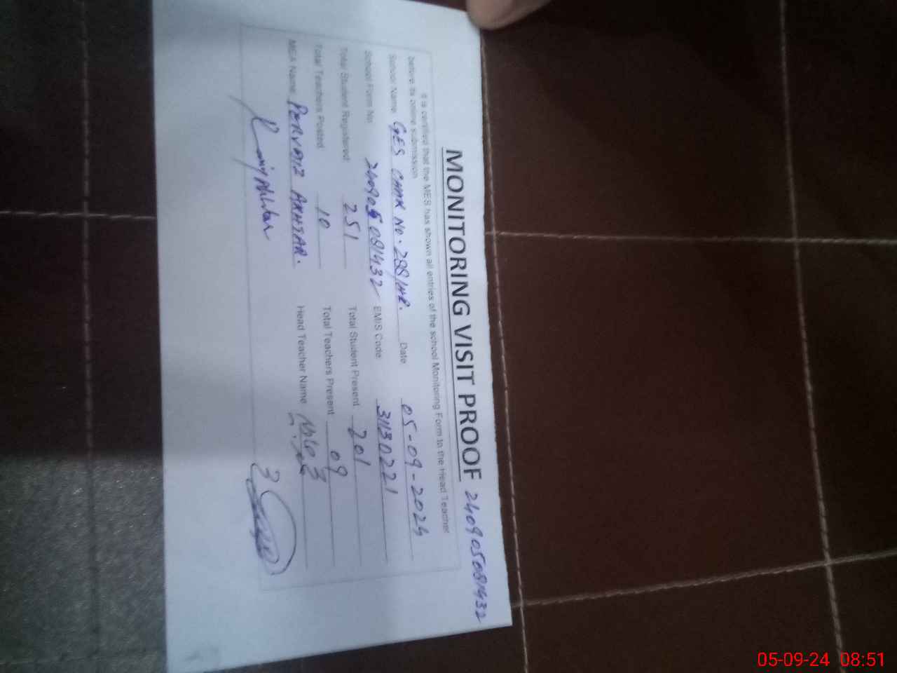 | Attendance Register | Head Teacher | MEA with School | Visit Proof |