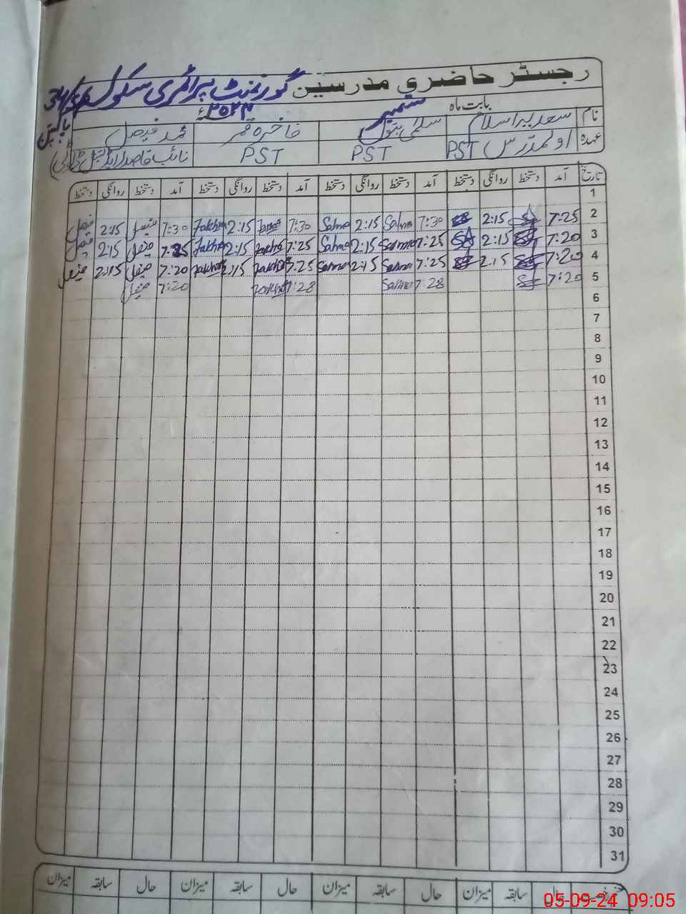 | Remarks (Use Separate Page if Required): Muhammad Faisal NQ is on additional duty in GPS 34 SP Today on 05 September 2024 he is absent from duty | |||||