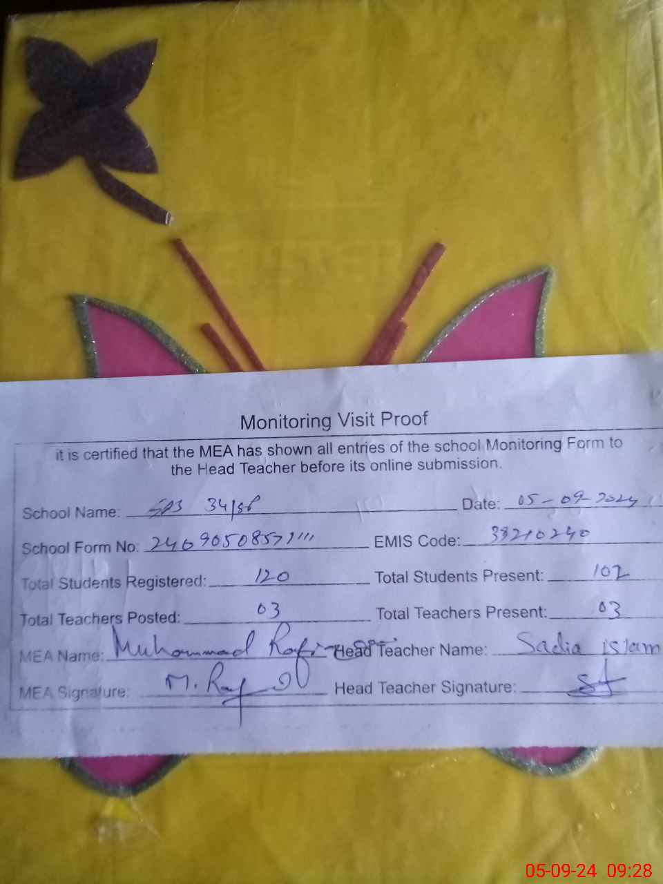 | Attendance Register | Head Teacher | MEA with School | Visit Proof |