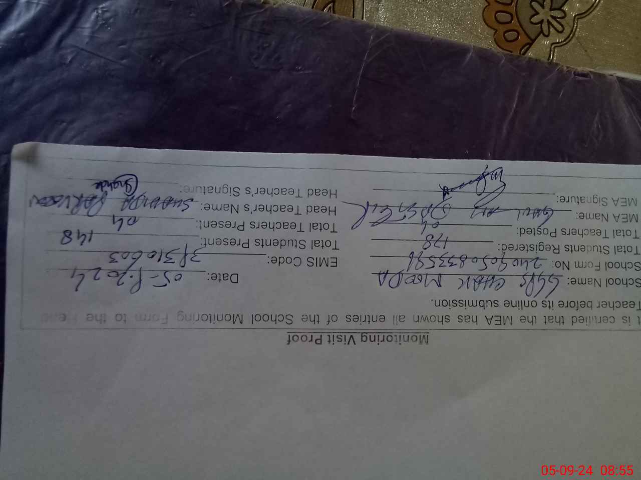 | Attendance Register | Head Teacher | MEA with School | Visit Proof |