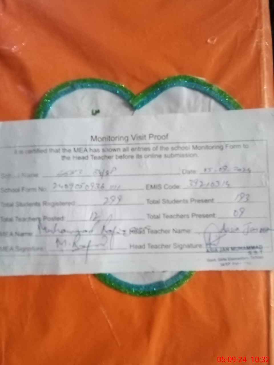 | Attendance Register | Head Teacher | MEA with School | Visit Proof |