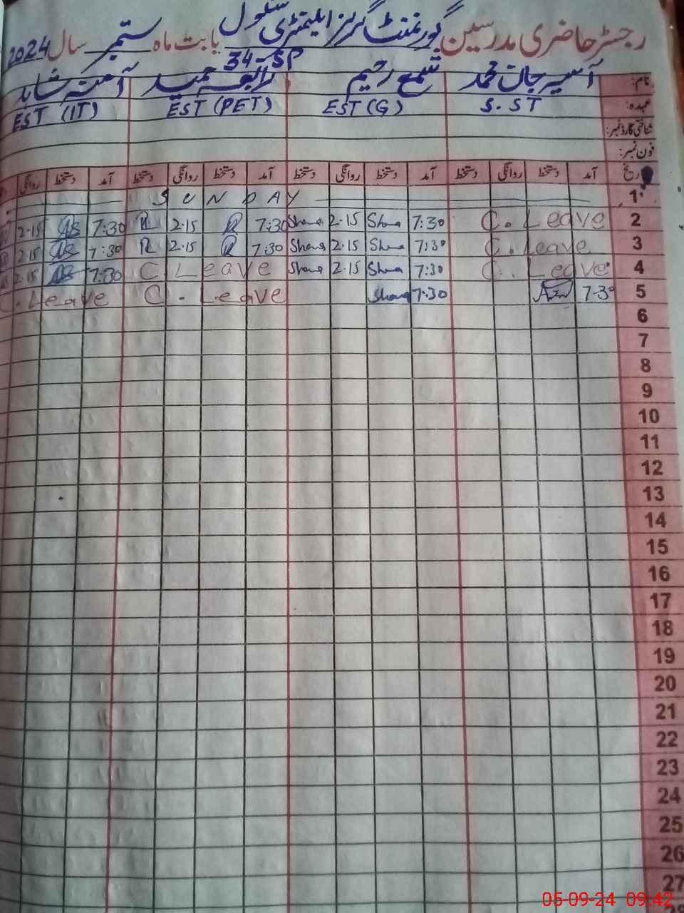 | CNIC | Full Name | Designation | R/C | Absence During Last Calender Month |