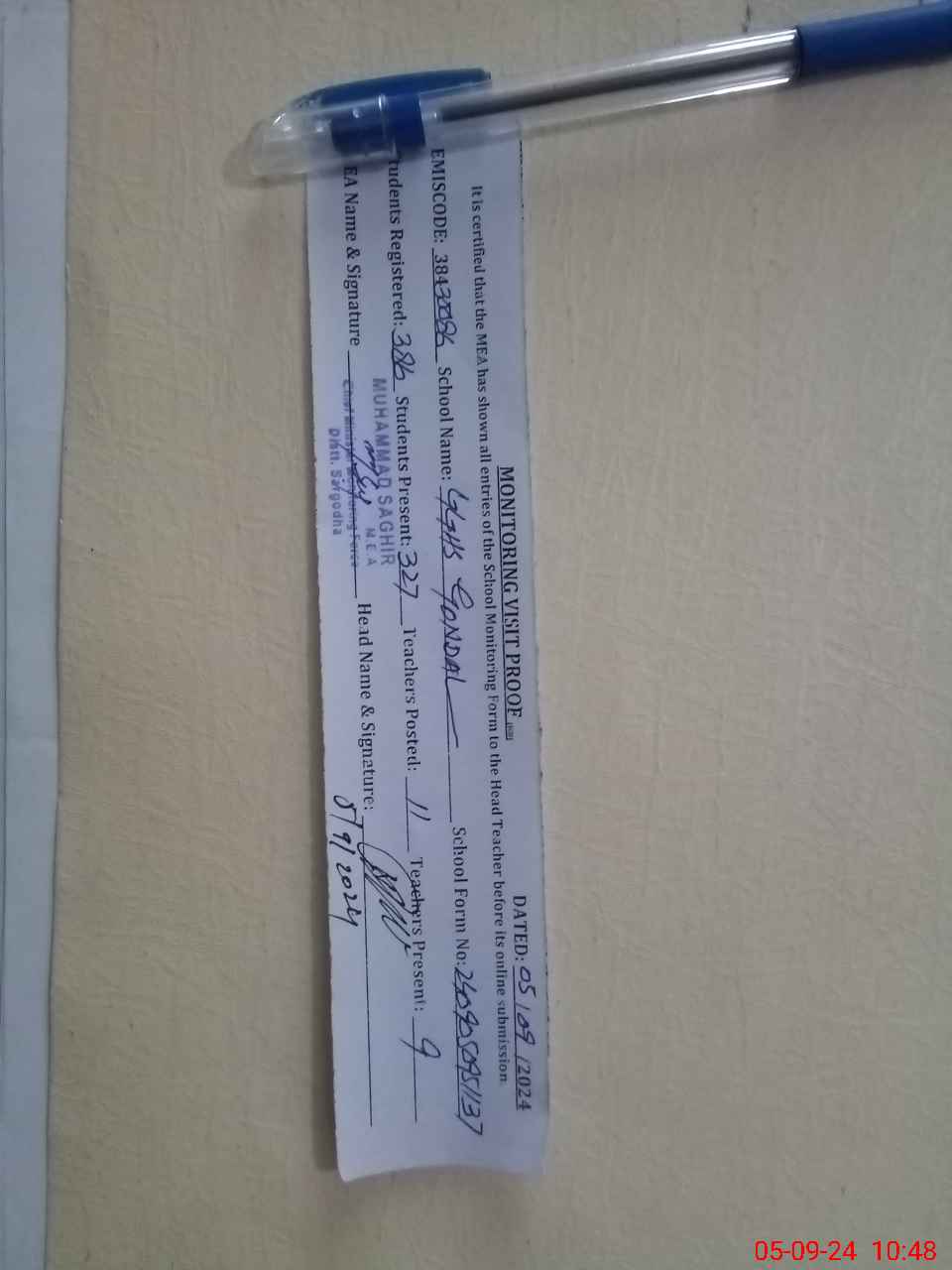| Certified that this School was Inspected by the Undersigned MEA/DMO Today and the Information Stated Above is as Per Record. | |||||