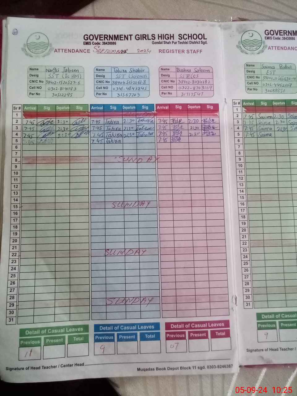 | CNIC | Full Name | Designation | R/C | Absence during last cal. month |