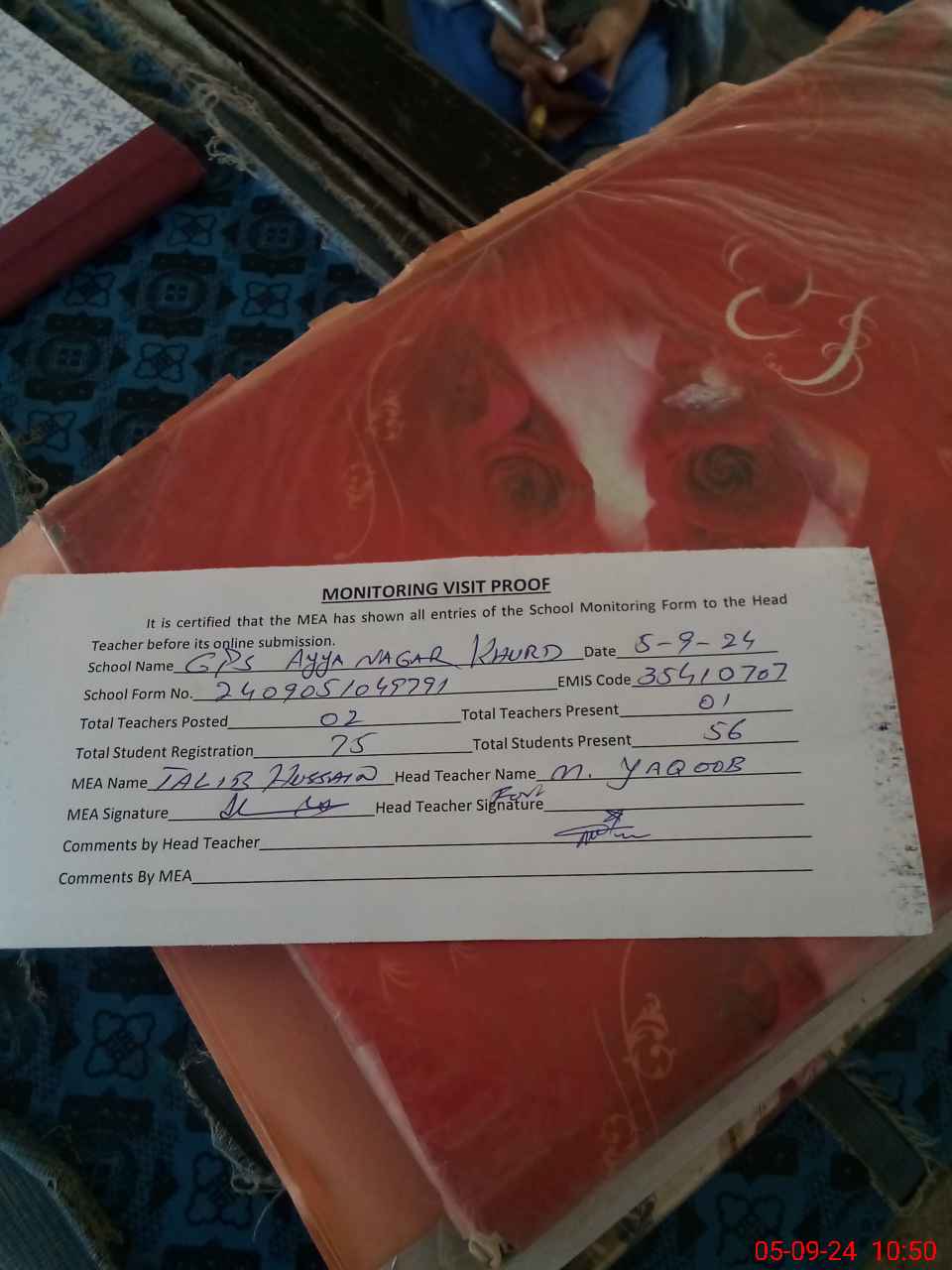 | Attendance Register | Head Teacher | MEA with School | Visit Proof |