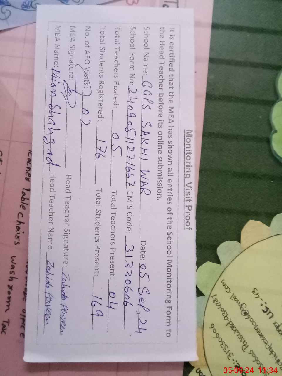 | Attendance Register | Head Teacher | MEA with School | Visit Proof |