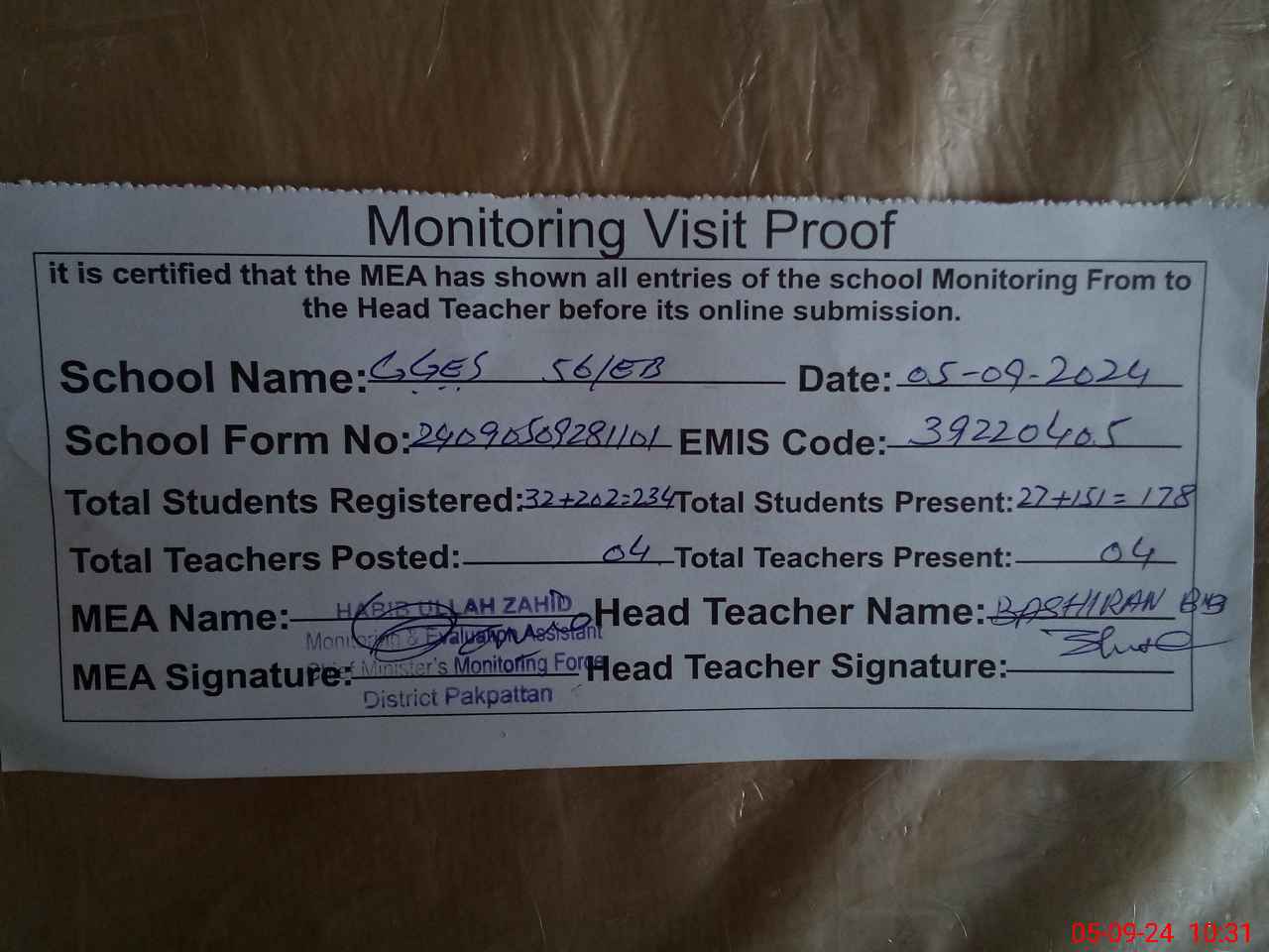 | Certified that this School was Inspected by the Undersigned MEA/DMO Today and the Information Stated Above is as Per Record. | |||||