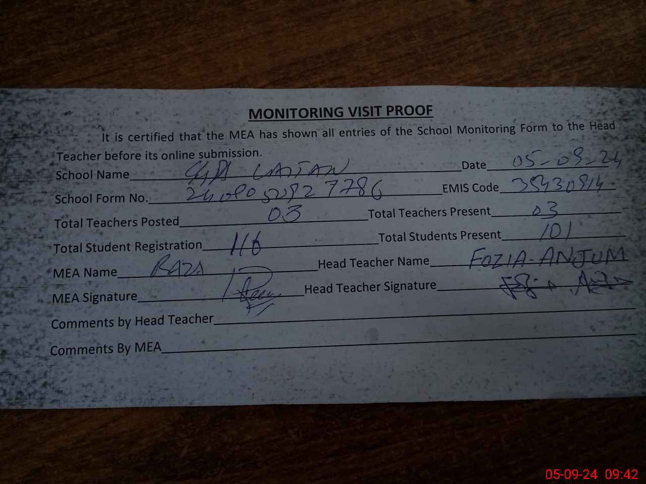 | Attendance Register | Head Teacher | MEA with School | Visit Proof |