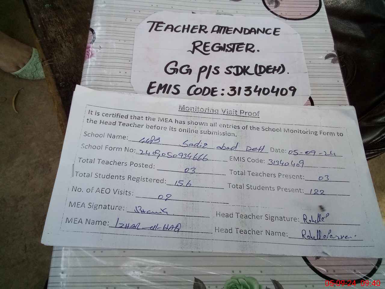 | Attendance Register | Head Teacher | MEA with School | Visit Proof |