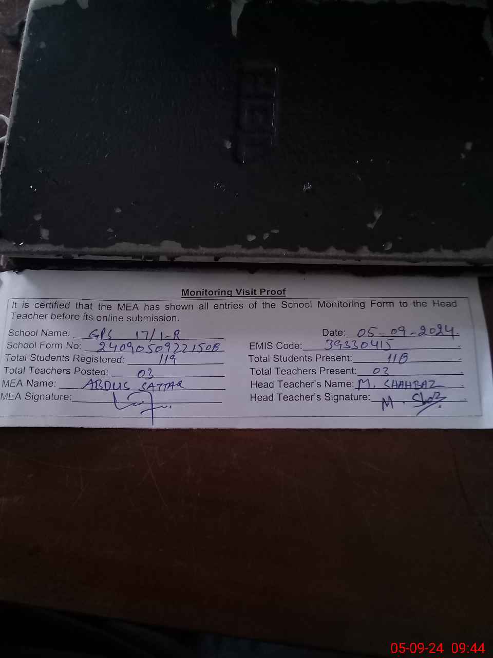 | Attendance Register | Head Teacher | MEA with School | Visit Proof |