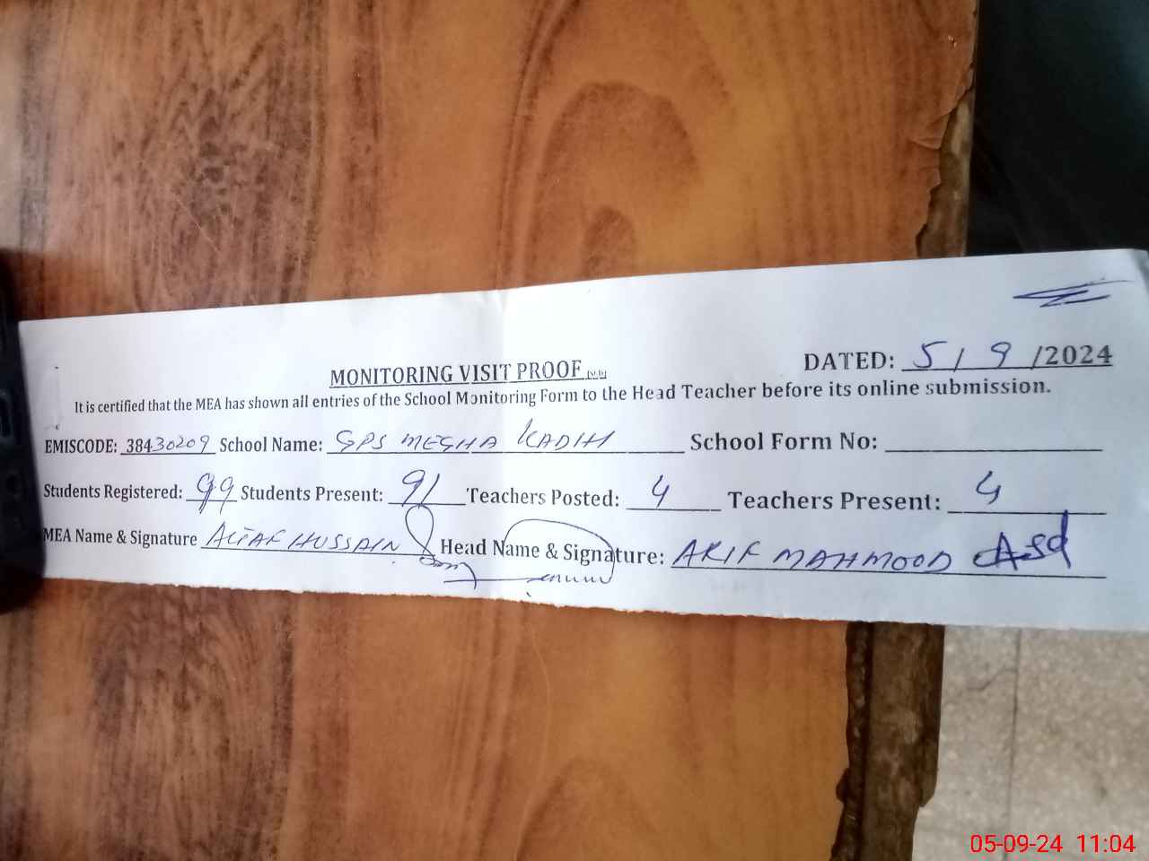 | Attendance Register | Head Teacher | MEA with School | Visit Proof |