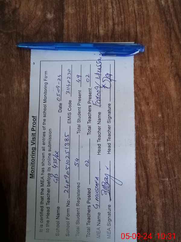 | Attendance Register | Head Teacher | MEA with School | Visit Proof |
