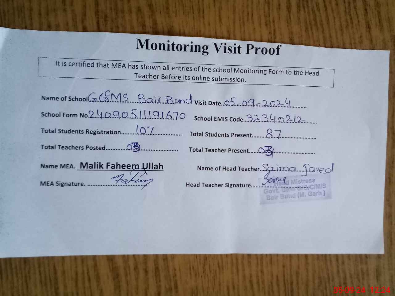 | Attendance Register | Head Teacher | MEA with School | Visit Proof |