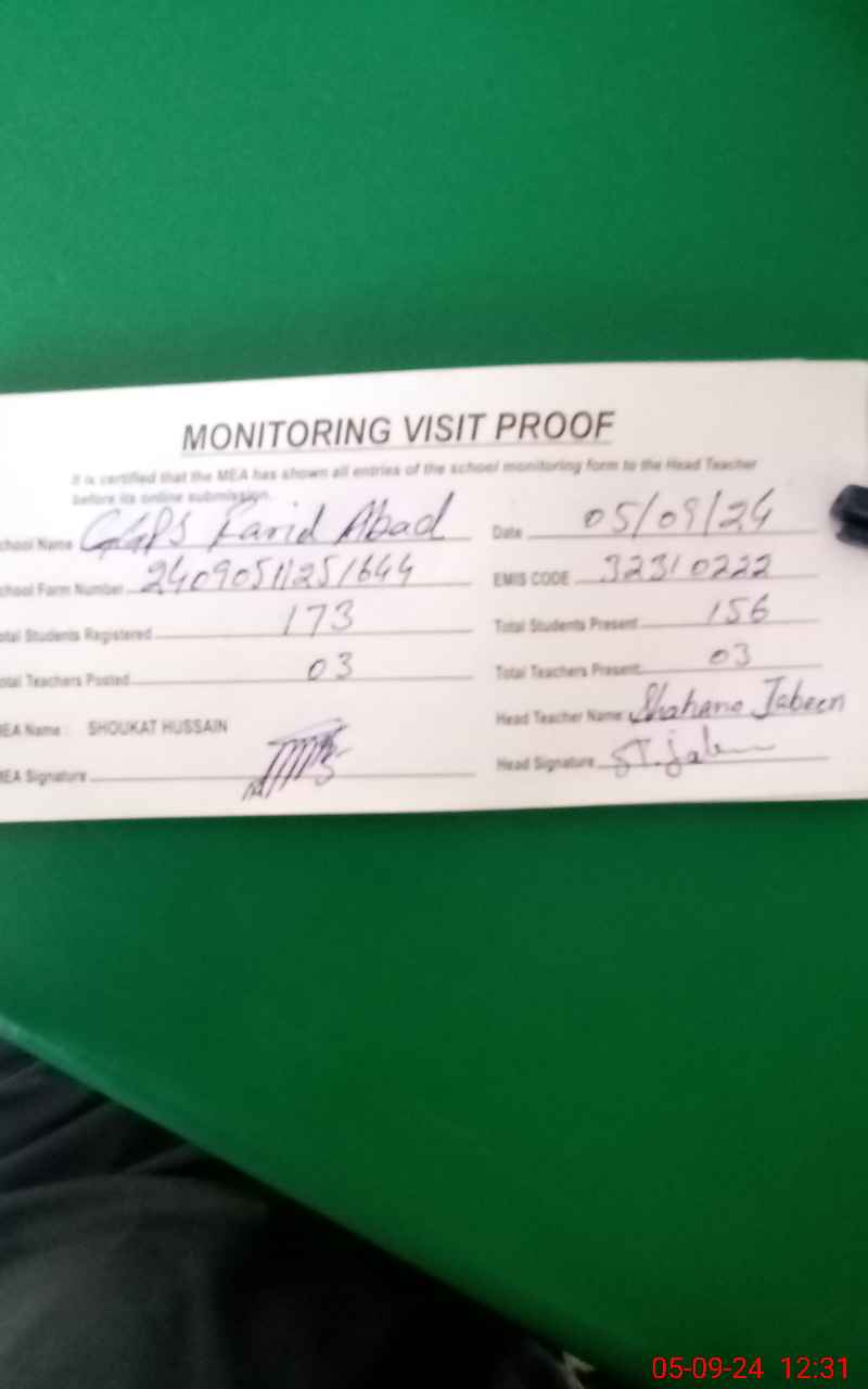 | EMIS Code: 32310222 | Name of School: GGPS FARID ABAD | |||