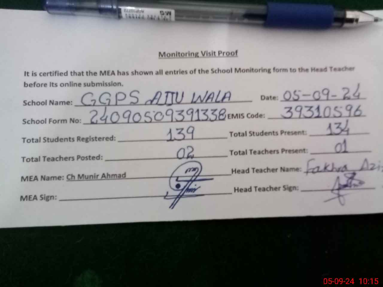 | Monitoring Date: 05-09-2024 | Start Time: 05-09-2024 09:30 AM | End Time: 05-09-2024 10:15 AM | Name of MEA: MU**** AH**** | |