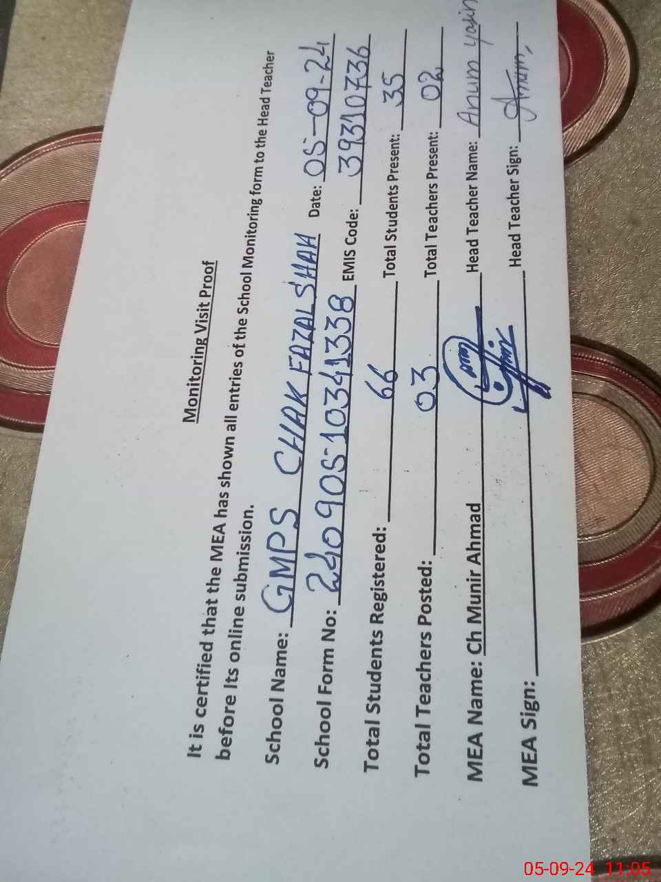 | Attendance Register | Head Teacher | MEA with School | Visit Proof |