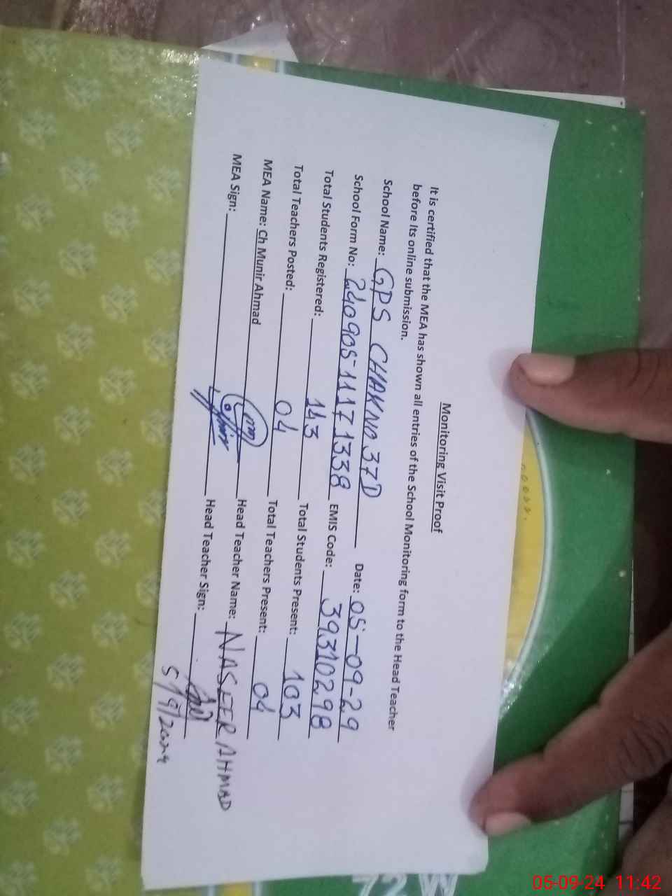 | Attendance Register | Head Teacher | MEA with School | Visit Proof |