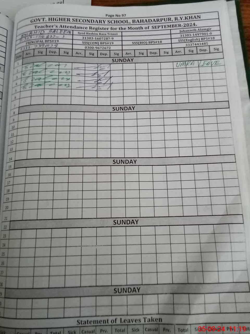 | Name: Sh**** Sa**** Ch Designation: (School Headmaster's/Headmistress's) Principal Phone/Cell Number: 03**** |