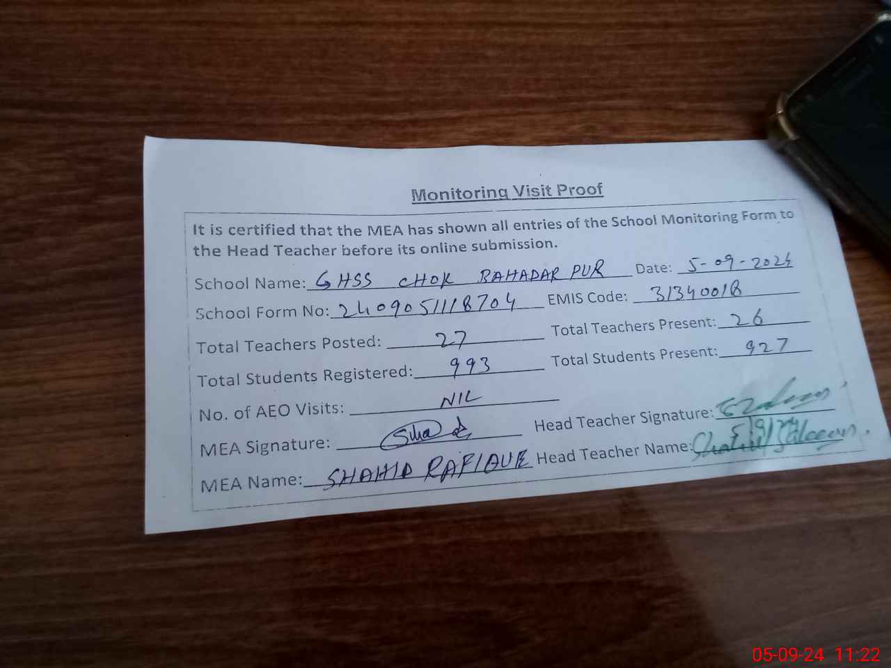 | Monitoring Date: 05-09-2024 | Start Time: 05-09-2024 10:32 AM | End Time: 05-09-2024 11:24 AM | Name of MEA: Sh**** Ra**** | |