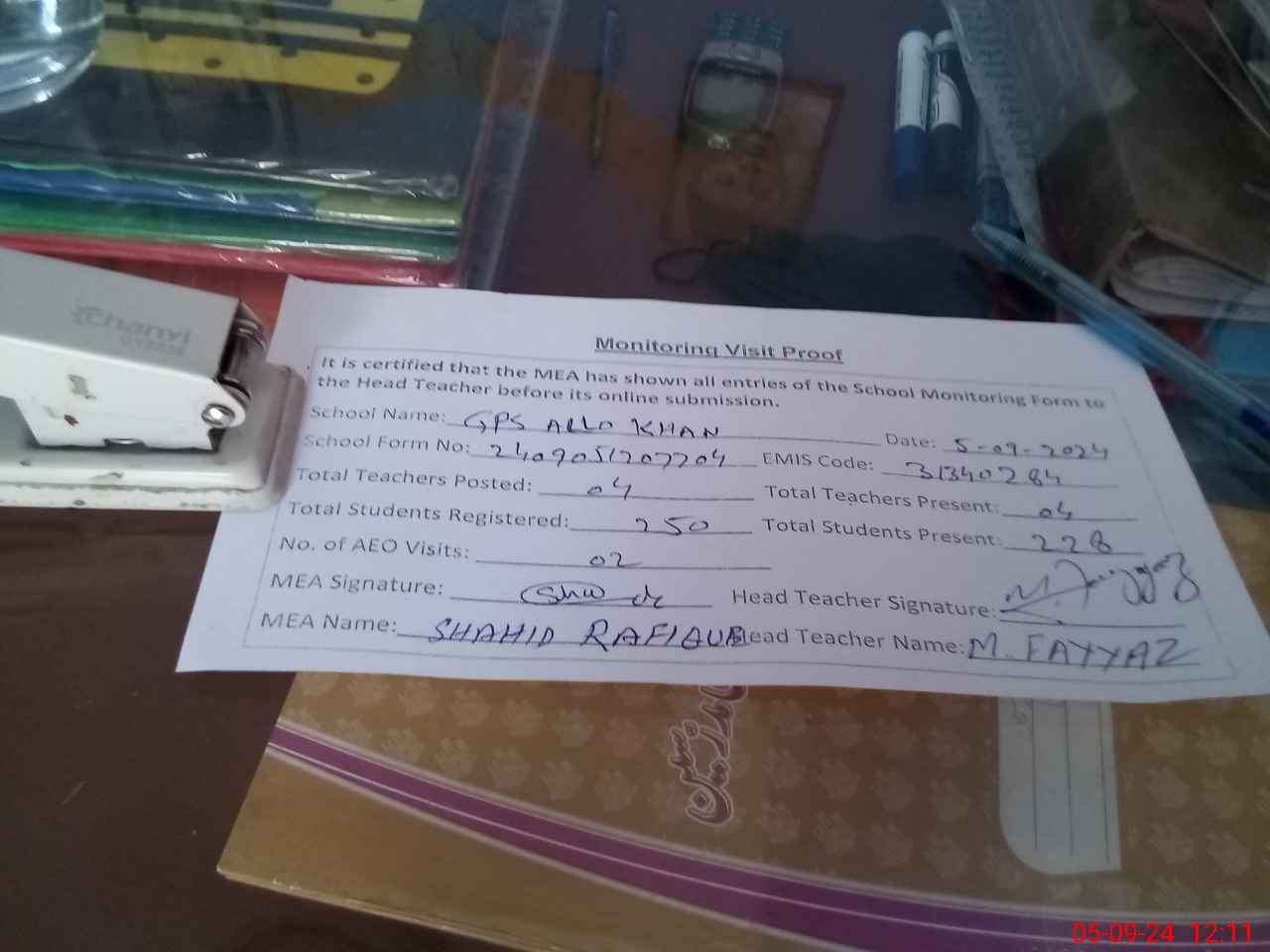 | Attendance Register | Head Teacher | MEA with School | Visit Proof |