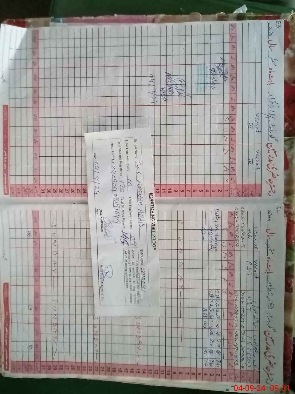 | Attendance Register | Head Teacher | MEA with School | Visit Proof |