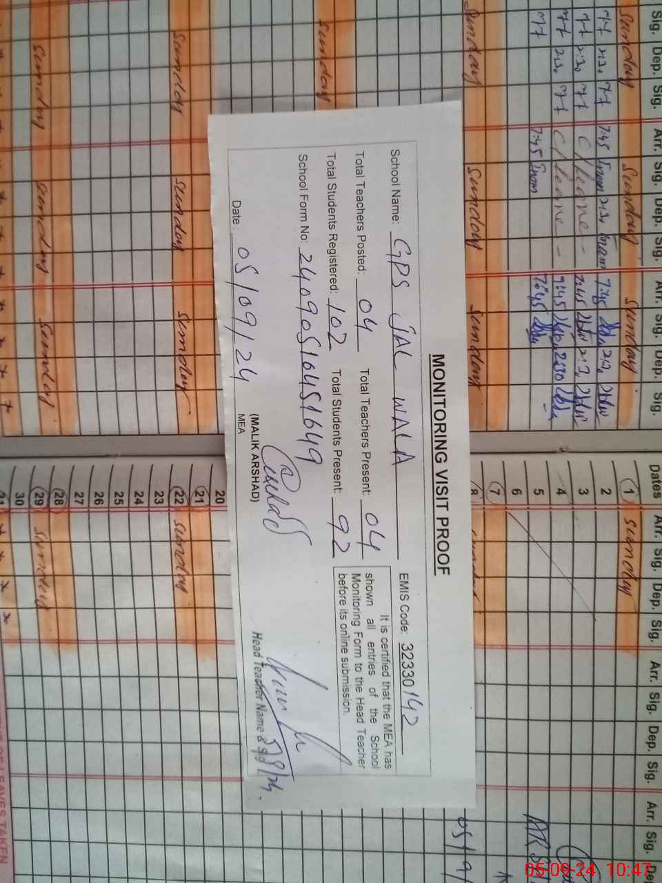 | Attendance Register | Head Teacher | MEA with School | Visit Proof |