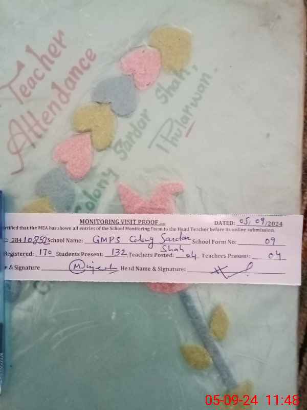 | EMIS Code: 38410852 | Name of School: GMPS COLONY SARDAR SHAH | |||