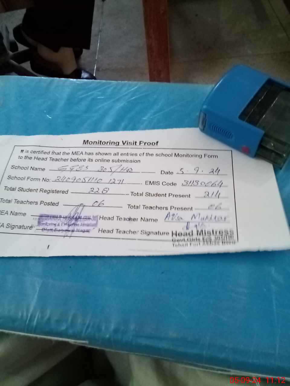 | Attendance Register | Head Teacher | MEA with School | Visit Proof |