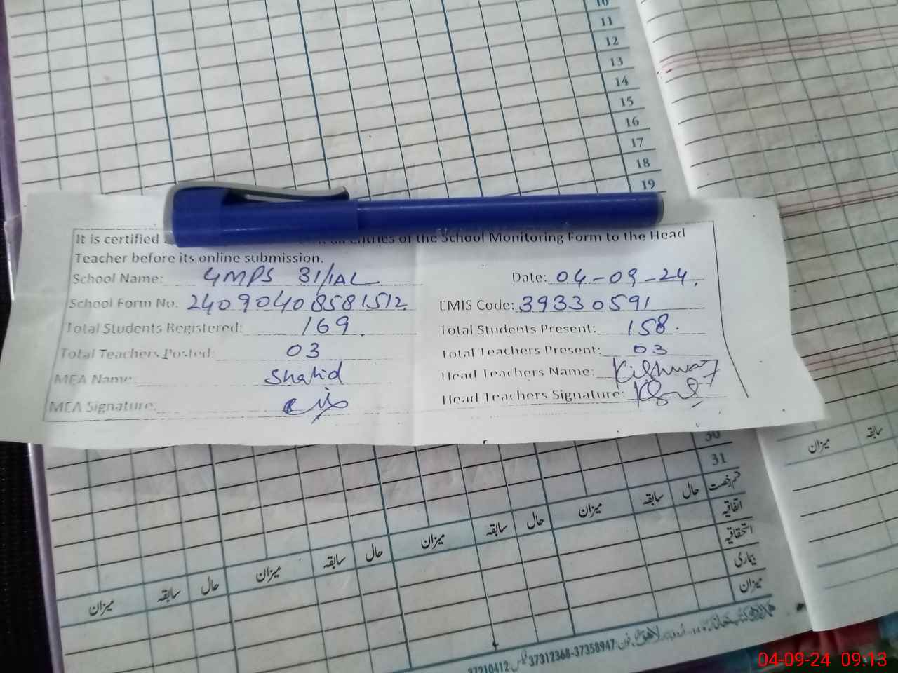 | Attendance Register | Head Teacher | MEA with School | Visit Proof |
