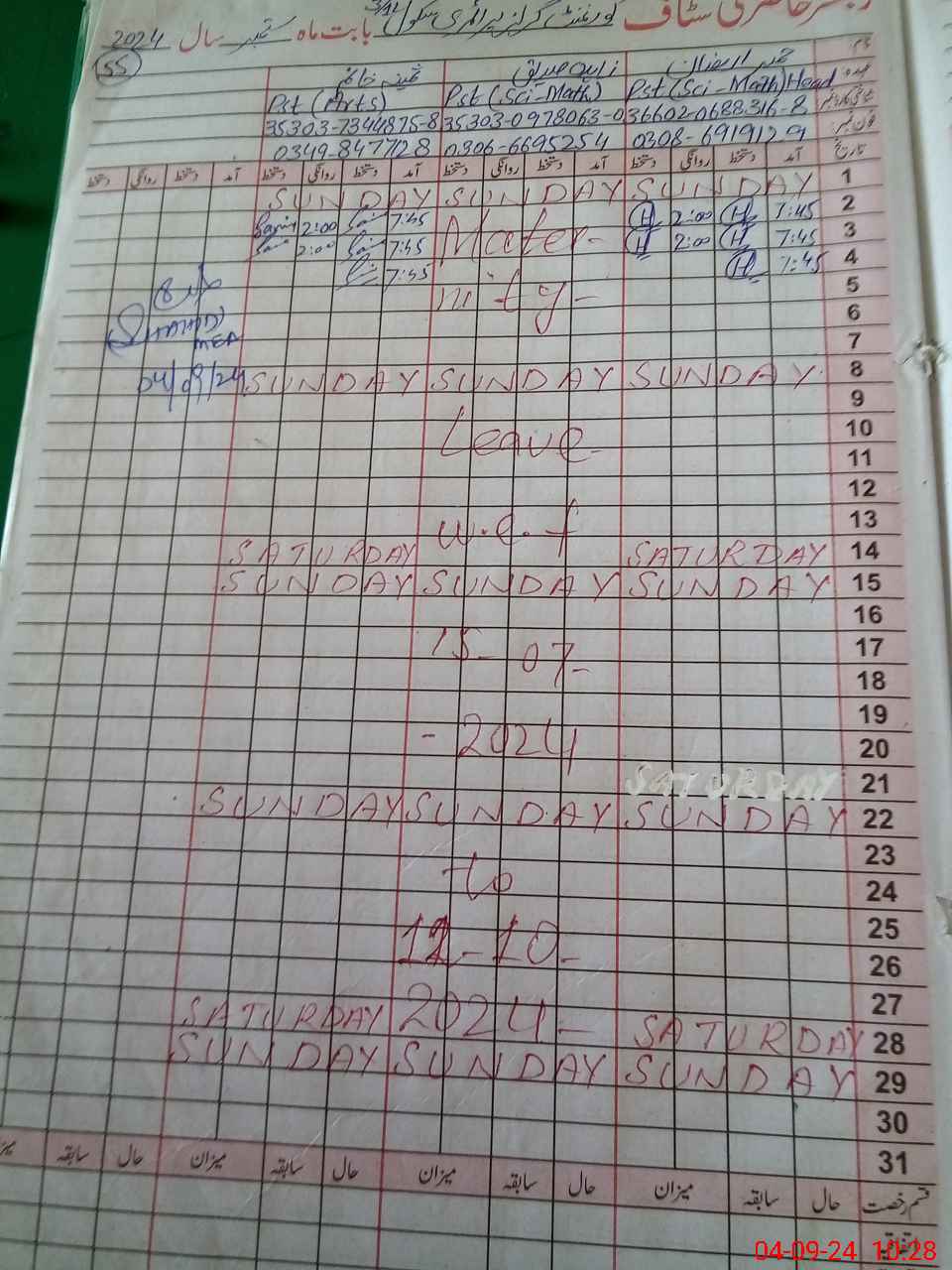 | Leave | Duty | Absent | Maternity | Medical | Ex- Pak |