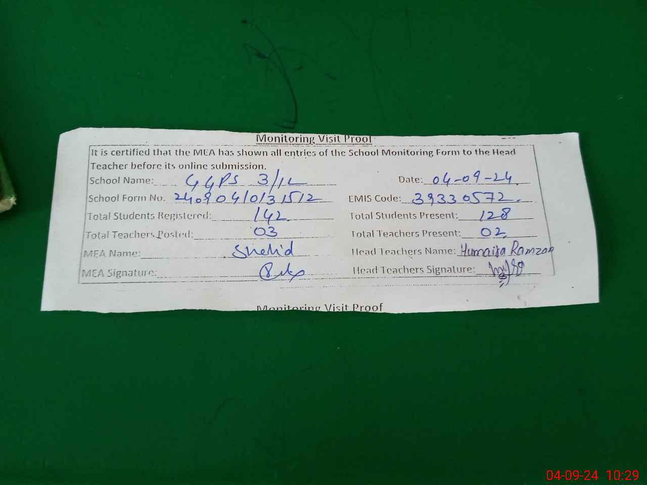 | Attendance Register | Head Teacher | MEA with School | Visit Proof |
