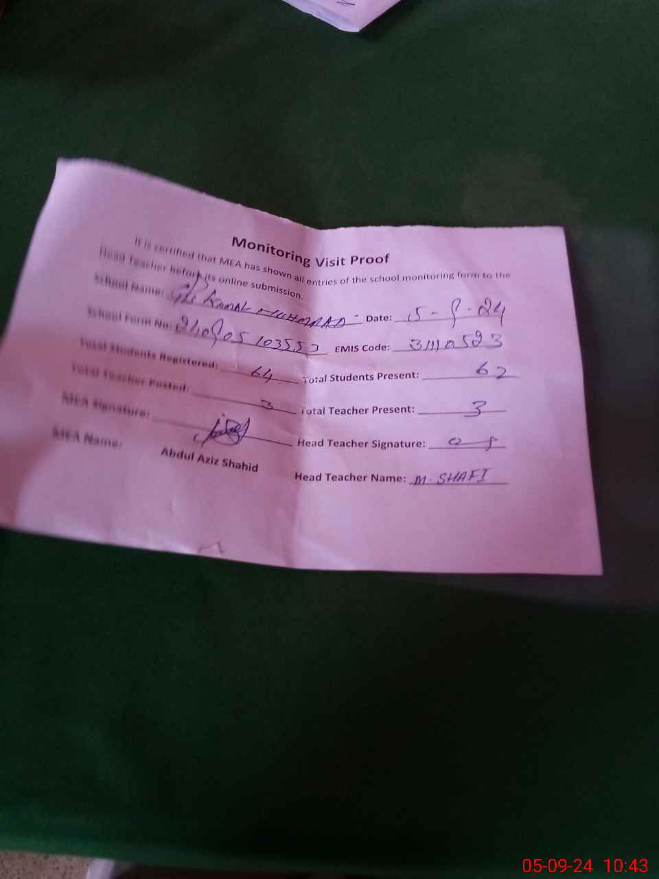 | Monitoring Date: 05-09-2024 | Start Time: 05-09-2024 10:35 AM | End Time: 05-09-2024 11:02 AM | Name of MEA: Ab**** Az**** Sh**** BN**** | |