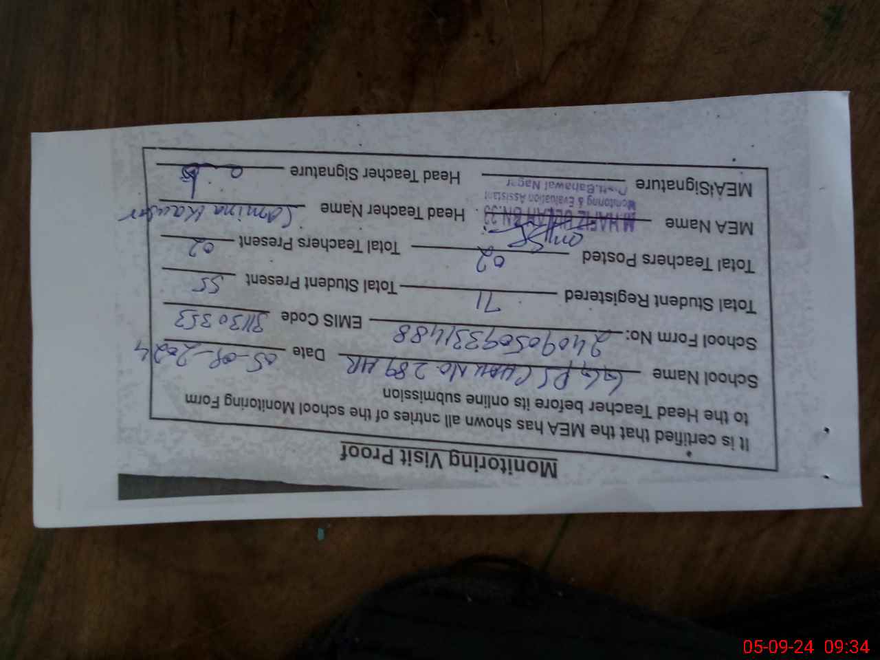 | Monitoring Date: 05-09-2024 | Start Time: 05-09-2024 09:15 AM | End Time: 05-09-2024 09:40 AM | Name of MEA: Mu**** Ha**** BN**** | |
